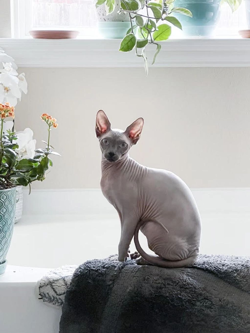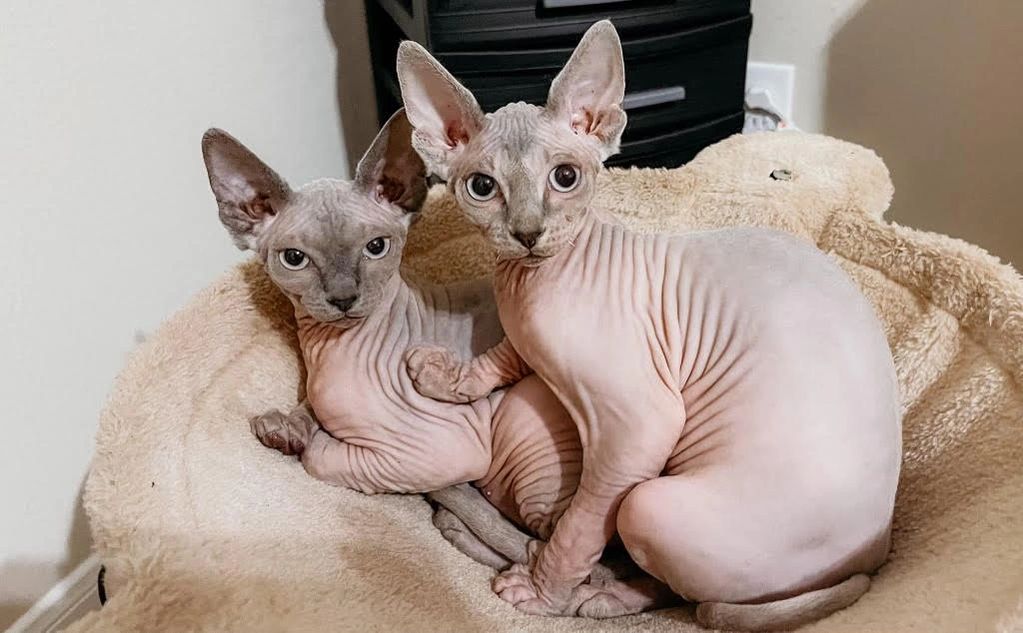 Marge is a lilac sphynx with very light blue almost white eyes.