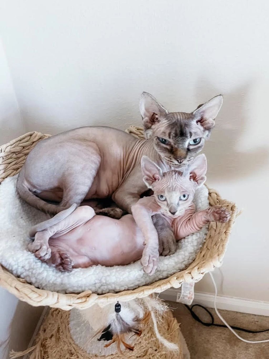 1st Queen, Marshmallow. Marshmallow is a unique sphnyx as she has some fur. Marshmallow also has a unique pattern of "tiger" striping on her legs. She is a loving mother, always up for snuggle time, and the best part.... She plays fetch with her toys.